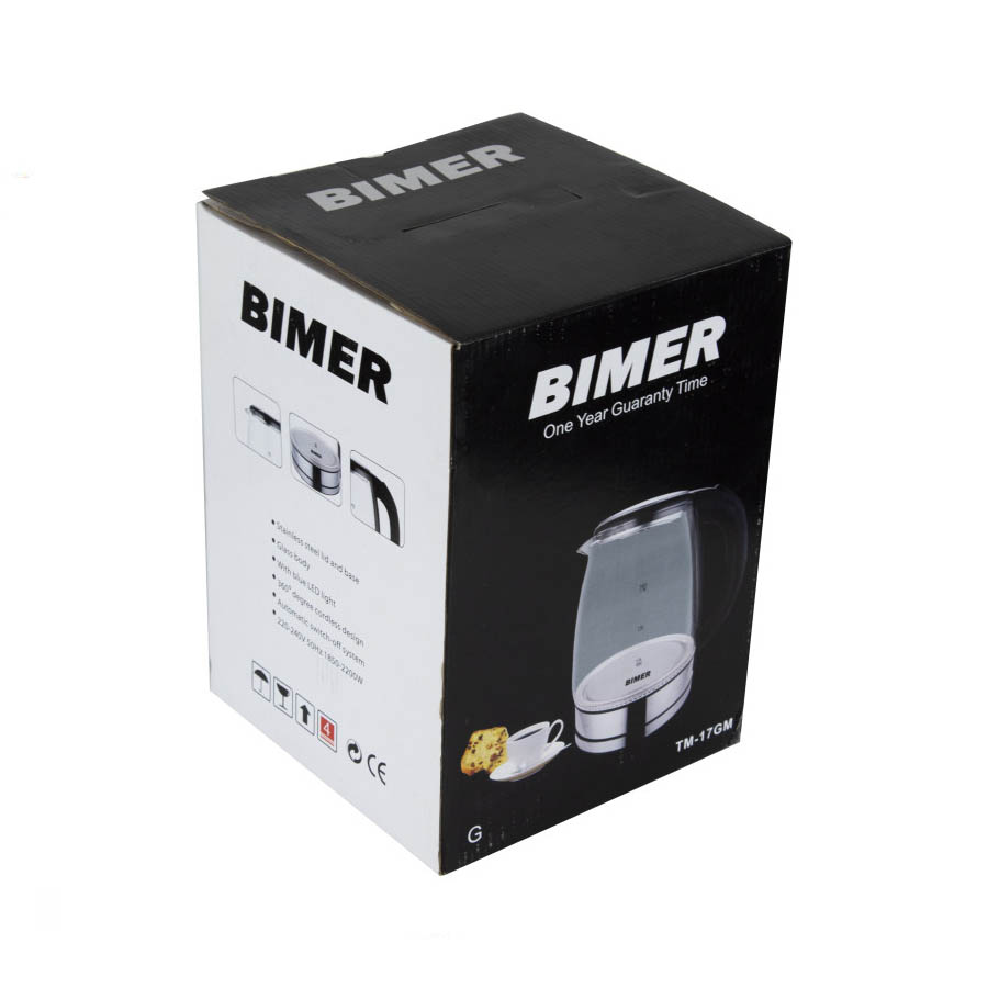 کتری برقی بیمر مدل TM-17G بدنه ای از جنس شیشه بسیار مقاوم دارد. این کتری با داشتن حجم 1.8 لیتری در مقایسه با محصولات مشابه، از ظرفیت بسیار مناسبی برای مصارف خانگی برخوردار است. این محصول دارای توان 2200 واتی است و در داخل آن چراغ های LED آبی رنگ تعبیه شده است که علاوه بر نشان دادن خاموش/روشن بودن دستگاه، جلوه زیبایی به آن می بخشد. کتری برقی بیمر مدل TM-17G دارای سیستم قطع کن خودکار است که استفاده از آن را ایمن میکند. همچنین این کتری بر روی کفی آن قابلیت چرخش 360 درجه ای دارد و بدنه این کفی و قسمت پایینی بدنه کتری از استیل ضدزنگ ساخته شده است.
